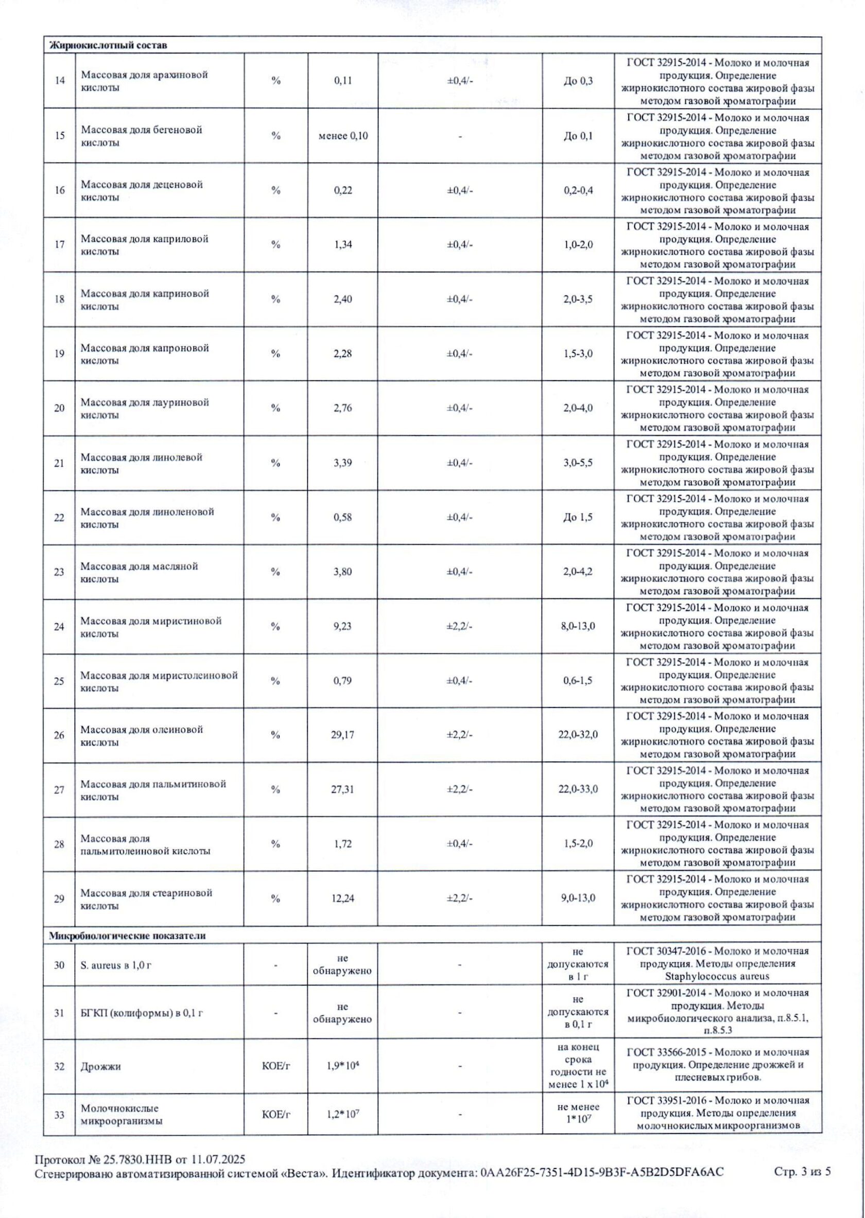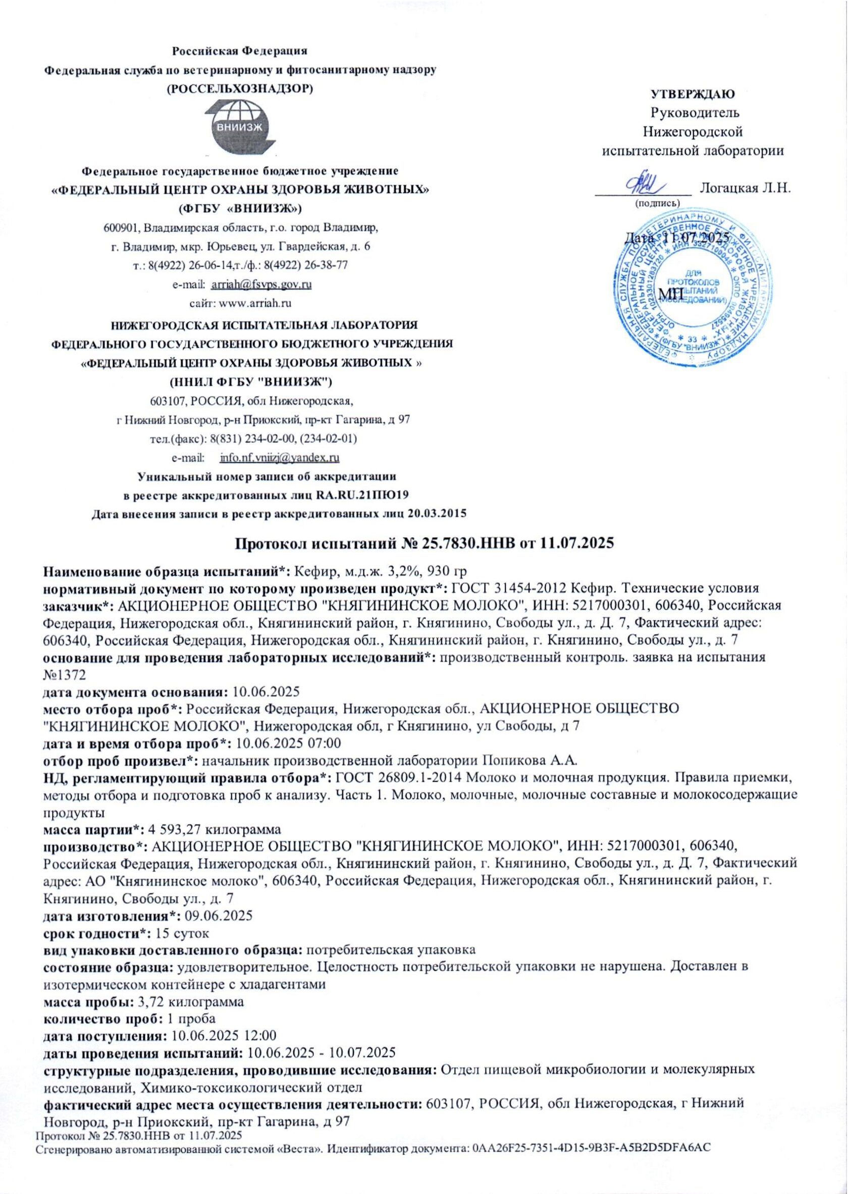 Протокол испытаний Кефир 3,2%